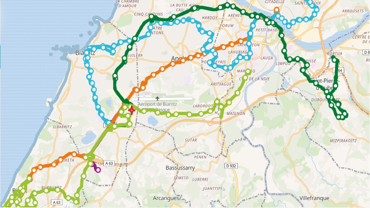 17:30 Larceveau, rond-point -> 17:50 St Jean Pied de Port, Jai Alai -> 18:00 Ossès, venta Peio -> 18:10 Bidarray, pont Noblia -> 18:25 Itxassou, rond-point route principale -> 18:30 Larressore, rond-point Bipia -> Biarritz